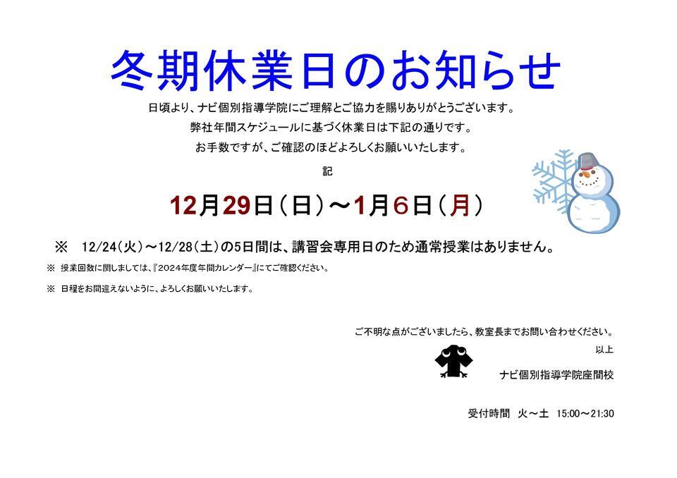 ナビ個別指導学院座間校は2025/12/24(火)より通常授業がお休みになります。