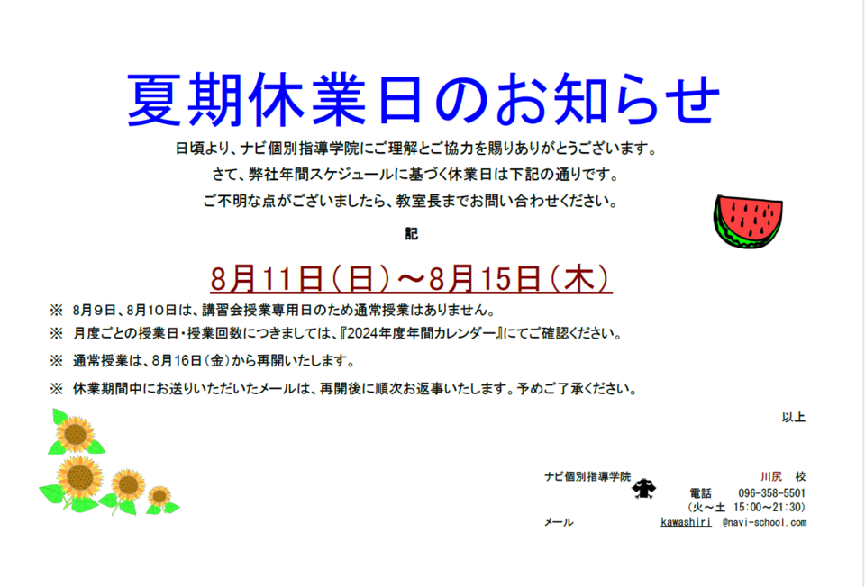 8月11日(日)~8月15日(木)は、夏期休業となります。