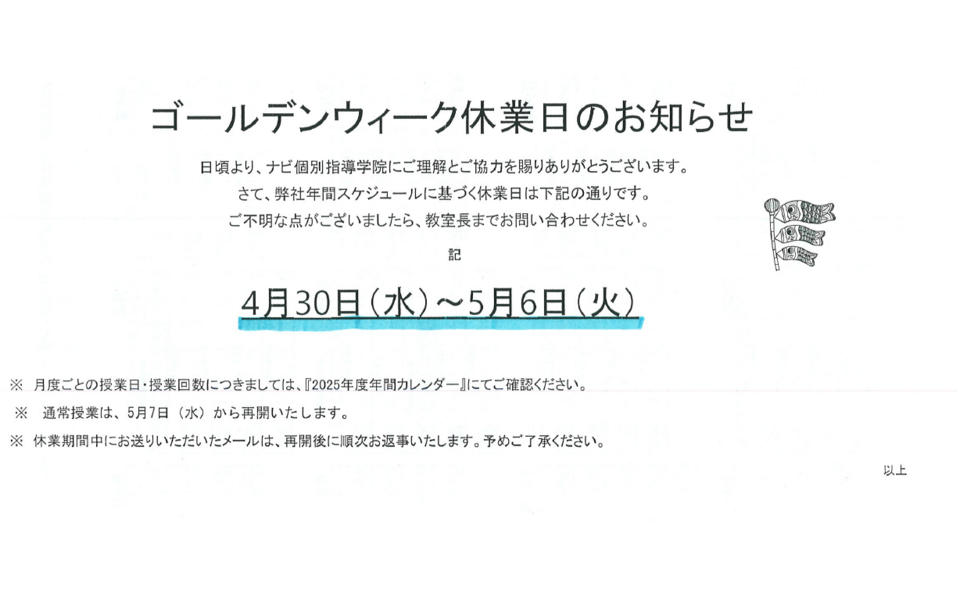 4月30日(水)~5月6日(火)は、ゴールデンウィーク休業となっております。