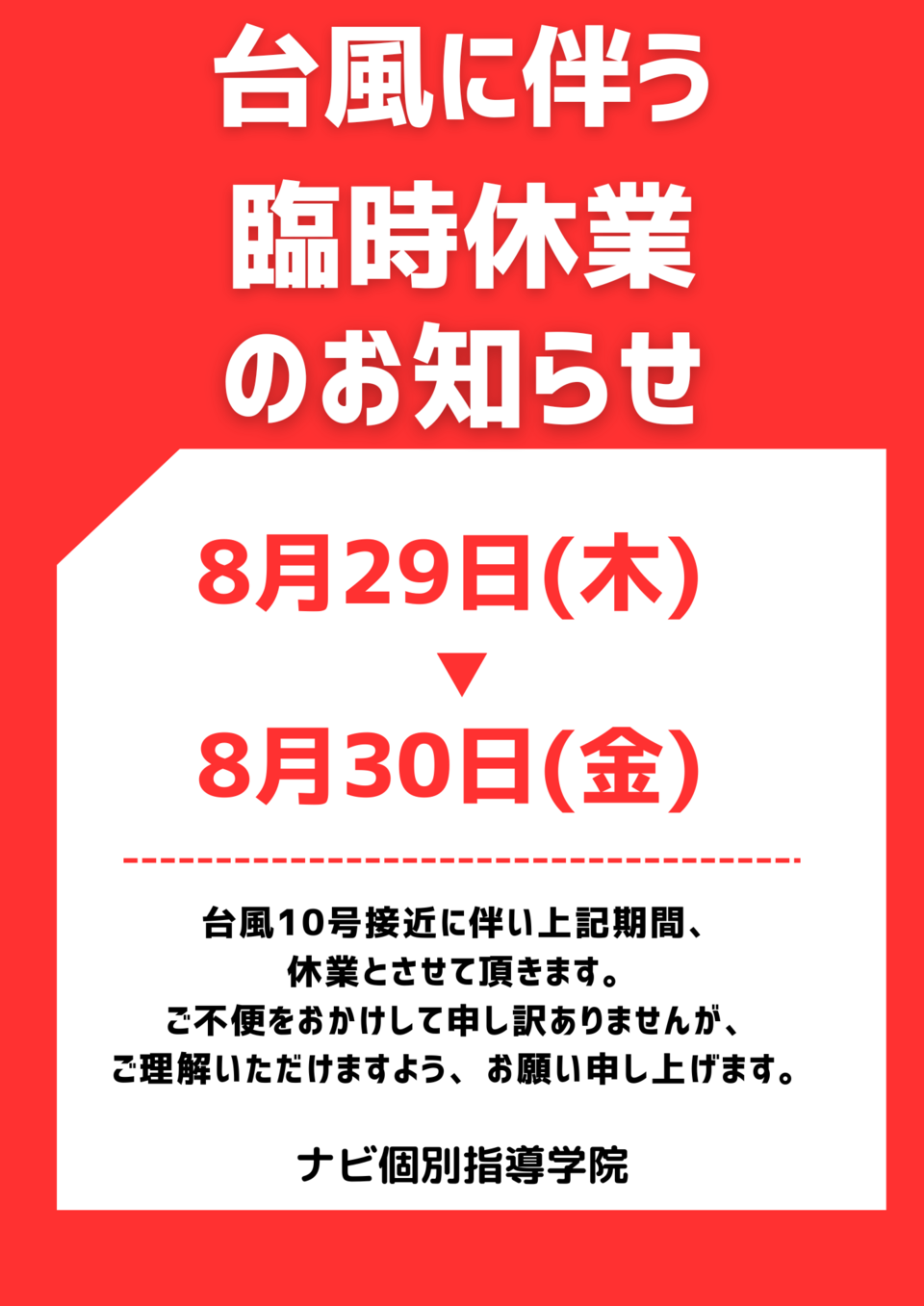 台風10号接近に伴う休校のお知らせ熊本の皆様へ台風10号の接近に伴い、生徒の安全確保を第一に考え、下記の通り休校とさせていただきます。休校日:8月29日(木)・8月30日(金)この期間中は、授業はすべて休講となります。台風による被害が最小限で済み、皆様が安全に過ごせることを心より願っております。ご不便をおかけしますが、ご理解とご協力をお願いいたします。ナビ個別指導学院 松橋校
