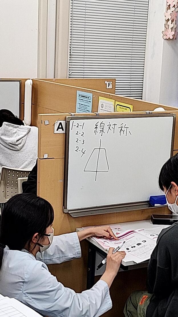 ナビ個別指導学院の授業は、個別の席ごとに設置された自分専用のホワイトボードで解き方や考え方を一緒に確認、それから生徒が問題を解くという「個別授業」スタイルです。