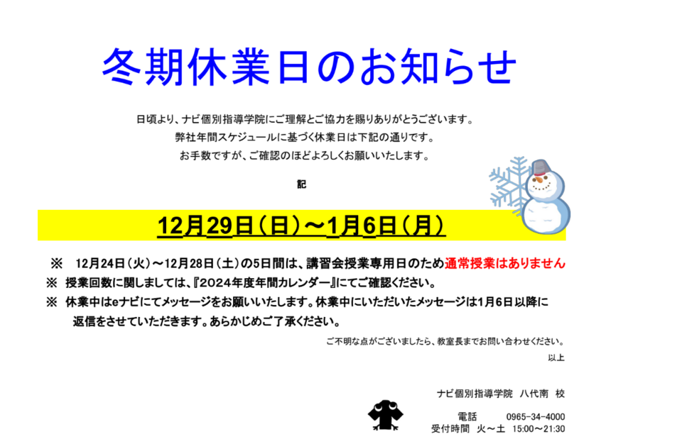 ※12月24日(火)~12月28日(土)は、講習会専用日のため通常授業はありません。