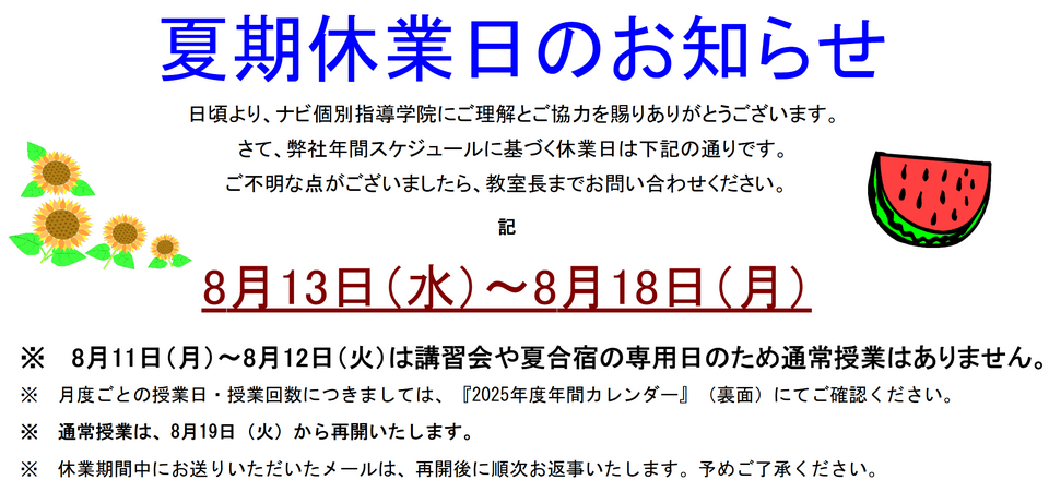 ※8月11日(月)と8月12日(火)は通常授業はございませんが、夏期講習会