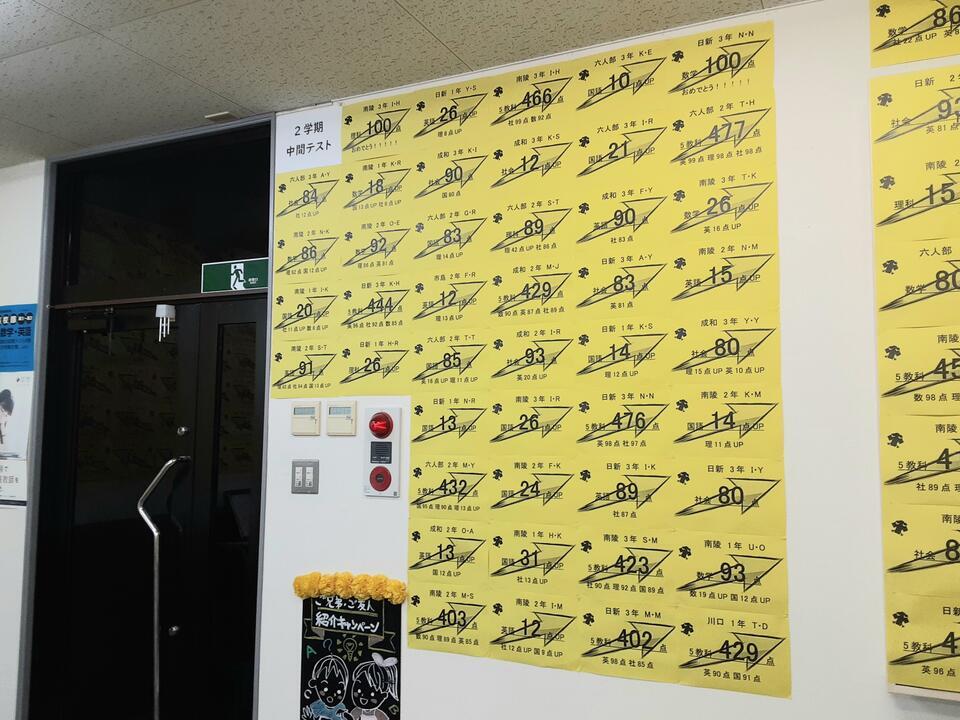 中間テストの高得点、成績アップの掲示も刷新しました。(添付写真)