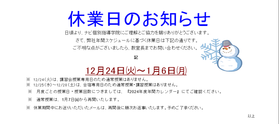 12/29(日)~1/6(月)までは冬期休業とさせていただきます。