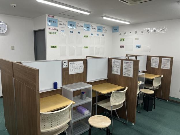 ナビ個別指導学院の授業は、個別の席ごとに設置された自分専用のホワイトボードで解き方や考え方を一緒に確認、それから生徒が問題を解くという「個別授業」スタイルです。