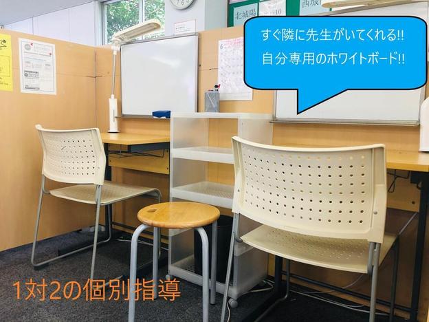 ナビ個別指導学院の授業は、個別の席ごとに設置された自分専用のホワイトボードで解き方や考え方を一緒に確認、それから生徒が問題を解くという「個別授業」スタイルです。