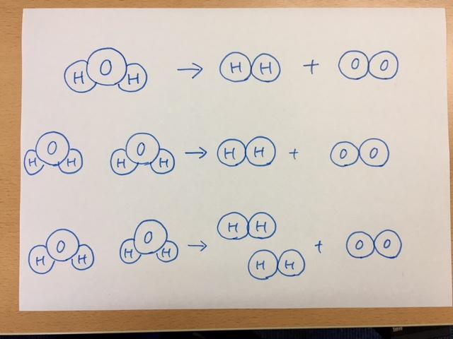 右側のH₂+O₂ではHが2個でOも2個・・・
