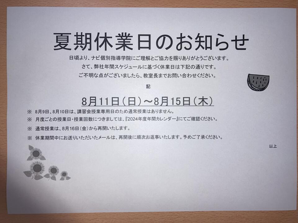 夏期休業のお知らせです。