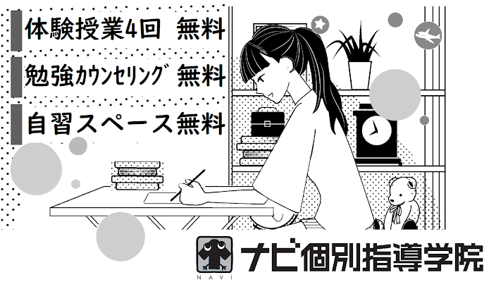 ナビでは1:2の通常授業の他に、1:3の講習会授業、1:1の完全個別授業、オンライン授業、英会話コース、、 などのコースがございます。
