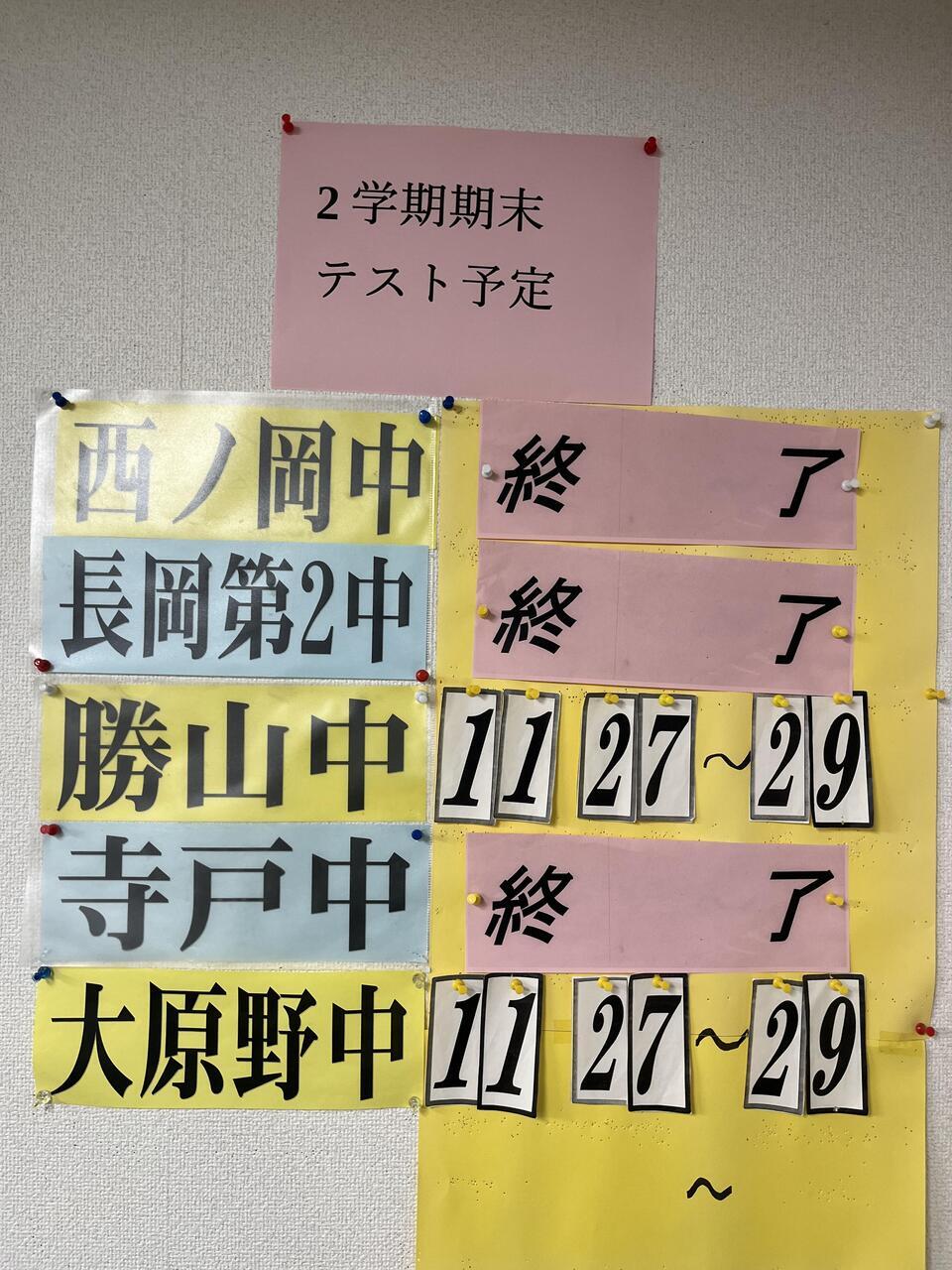 大原野中、勝山中の皆さんはいよいよ、本日から期末テストスタートです。