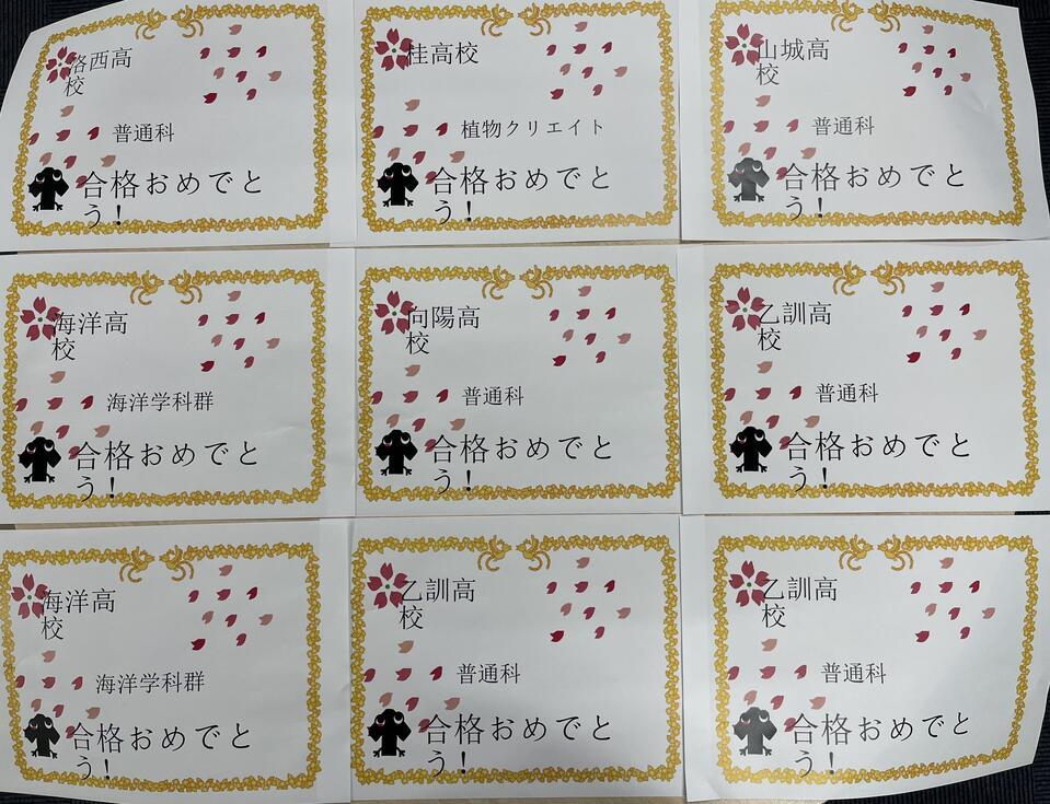 お足元の悪いなか来て頂くことになりそうですので、どうか本日もお気をつけてお越し下さい。ご自分で教室まで来て頂いてる生徒の皆さん、いつもお疲れ様です。くれぐれも、車等、道中細心の注意払って教室までお越し下さい。 先日3/7に行われた公立高校中期入試で合格の嬉しい声が届いてます。Aさん、洛西高校普通科合格‼Iくん、海洋高校海洋学科群合格‼Yさん、乙訓高校普通科合格‼Hさん、山城高校普通科合格‼T君、向陽高校普通科合格‼S君、乙訓高校普通科合格‼F君、桂高校植物クリエイト合格‼K君、乙訓高校普通科合格‼E君、海洋高校海洋学科群合格‼