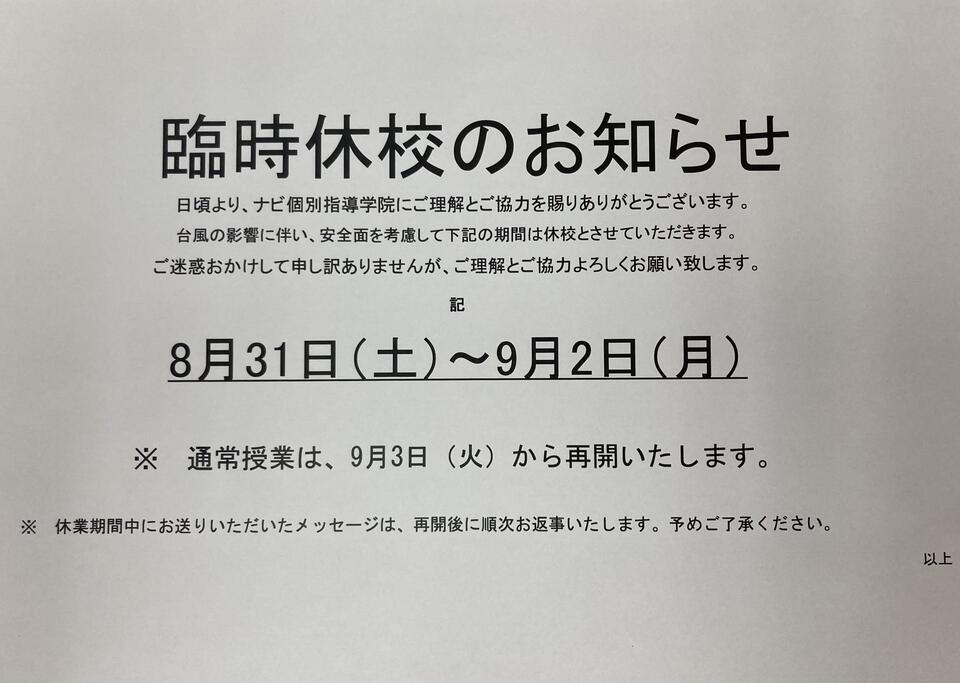 なお、休校中にいただいたご連絡は9/3(火)以降に返信させていただきます。
