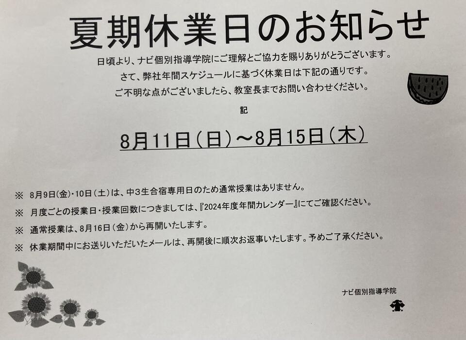 上記休業期間中は、教室は開校しておりませんのでご注意ください。