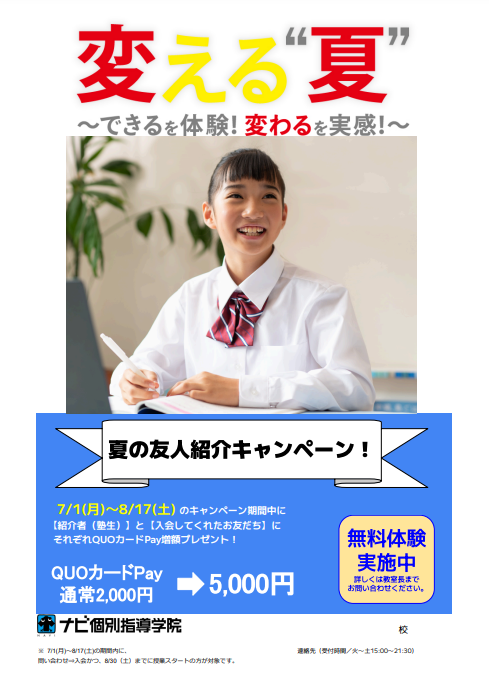 ナビ個別では友人を紹介していただきその友人が入塾しますと