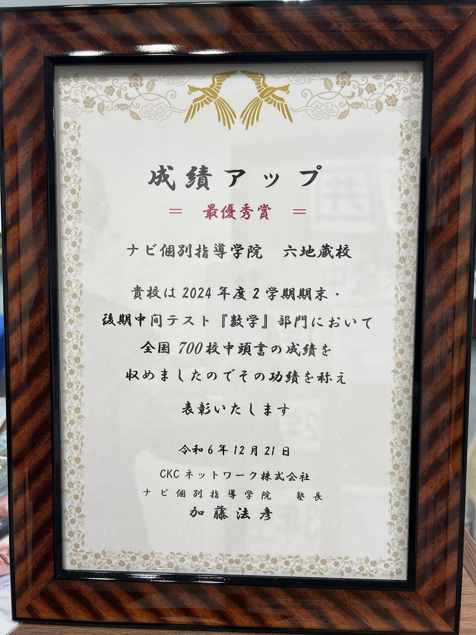 2学期末テスト【数学部門】 で成績アップ最優秀賞を受賞しました!!!