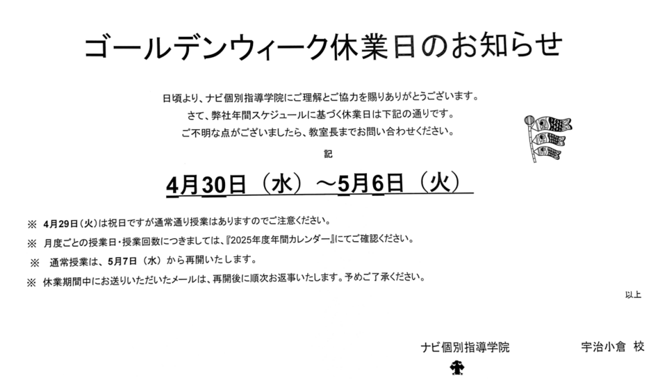 4/30(水)~5/6(火)はゴールデンウィーク休業となっております。体験授業、教室見学など何かございましたら、5/7(水)以降にご連絡ください。中間・期末テストに向けて、いいスタートダッシュができるよう、近鉄小倉駅徒歩2分の教室でお待ちしております。