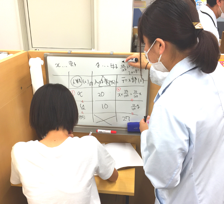 ナビ個別指導学院の授業は、個別の席ごとに設置された自分専用のホワイトボードで解き方や考え方を一緒に確認、それから生徒が問題を解くという「個別授業」スタイルです。