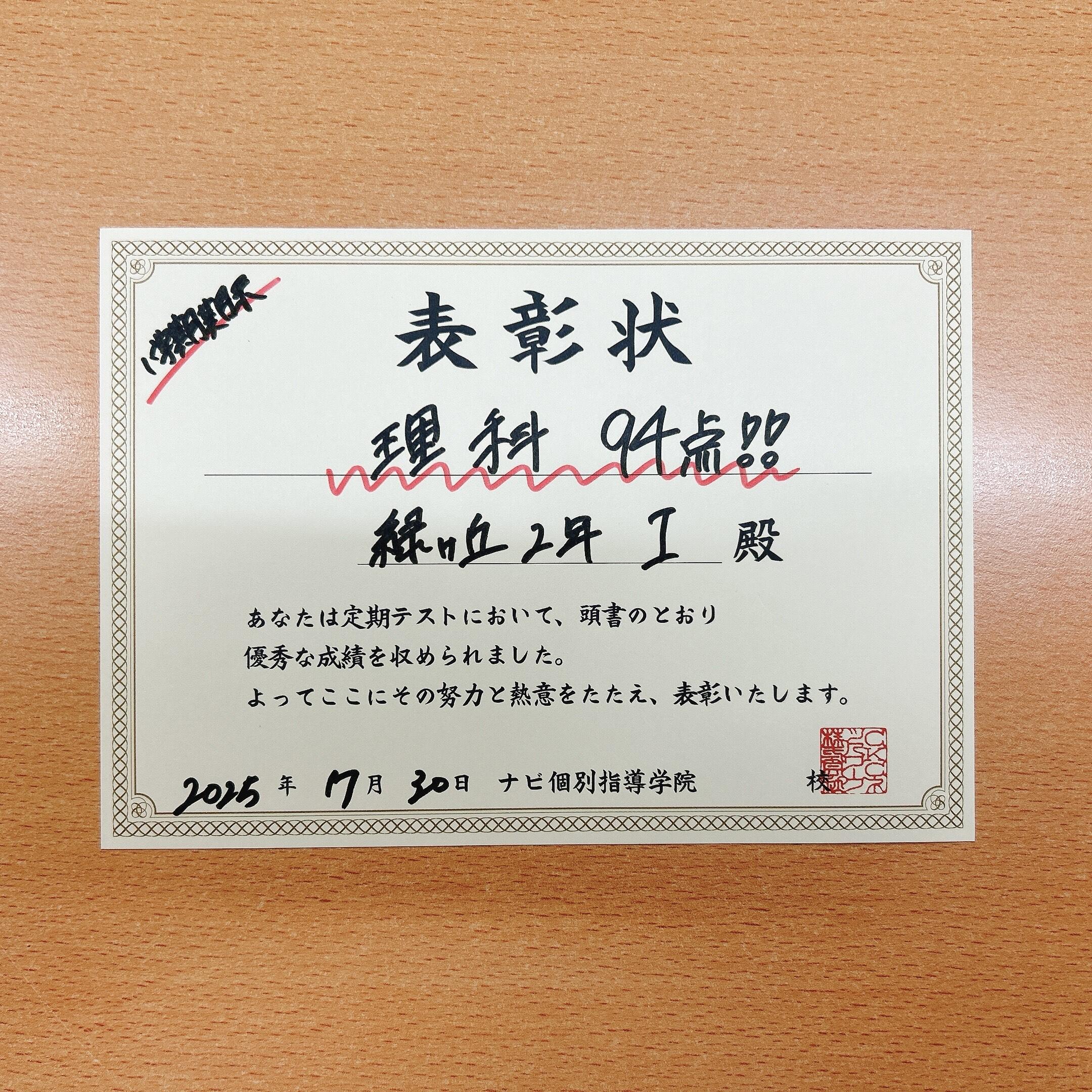 伊賀市の皆様、こんにちは。伊賀市の個別塾、ナビ個別指導学院伊賀校です。嬉しい1学期期末テストの高得点報告です。今日ご紹介するのは緑ヶ丘中学校2年生の生徒さんです。理科 94点!!すばらしい成績です!!!おめでとう!!!