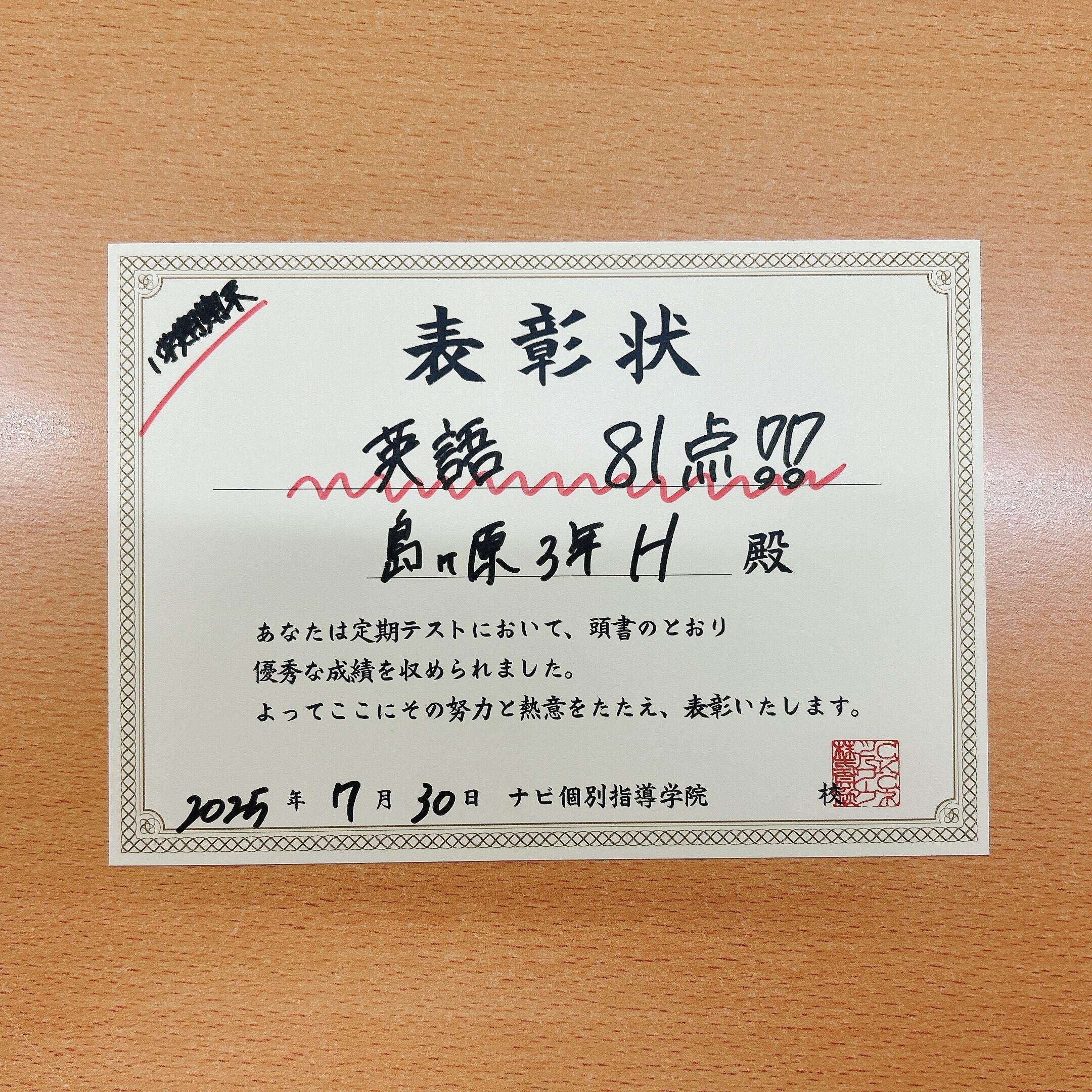 伊賀市の皆様、こんにちは。伊賀市の個別塾、ナビ個別指導学院伊賀校です。嬉しい1学期期末テストの高得点報告です。今日ご紹介するのは島ヶ原中学校3年生の生徒さんです。英語 81点!!すばらしい成績です!!!おめでとう!!!