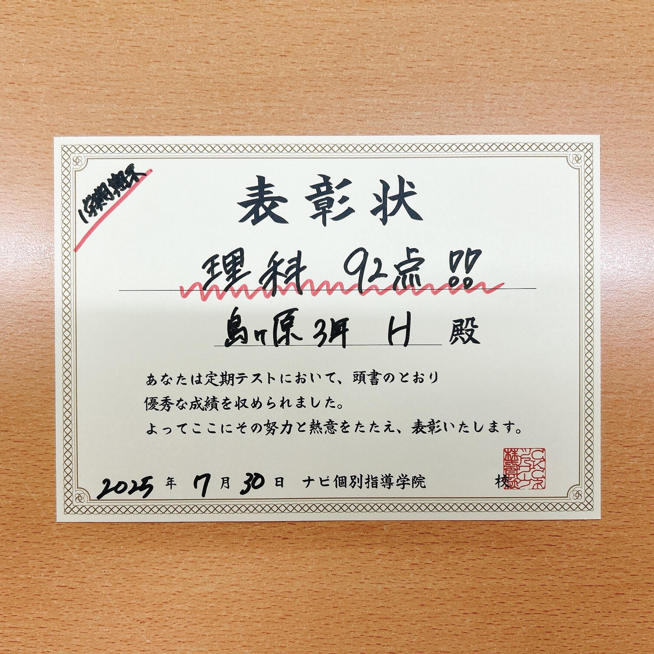 伊賀市の皆様、こんにちは。伊賀市の個別塾、ナビ個別指導学院伊賀校です。嬉しい1学期期末テストの高得点報告です。今日ご紹介するのは島ヶ原中学校3年生の生徒さんです。理科 92点!!すばらしい成績です!!!おめでとう!!!