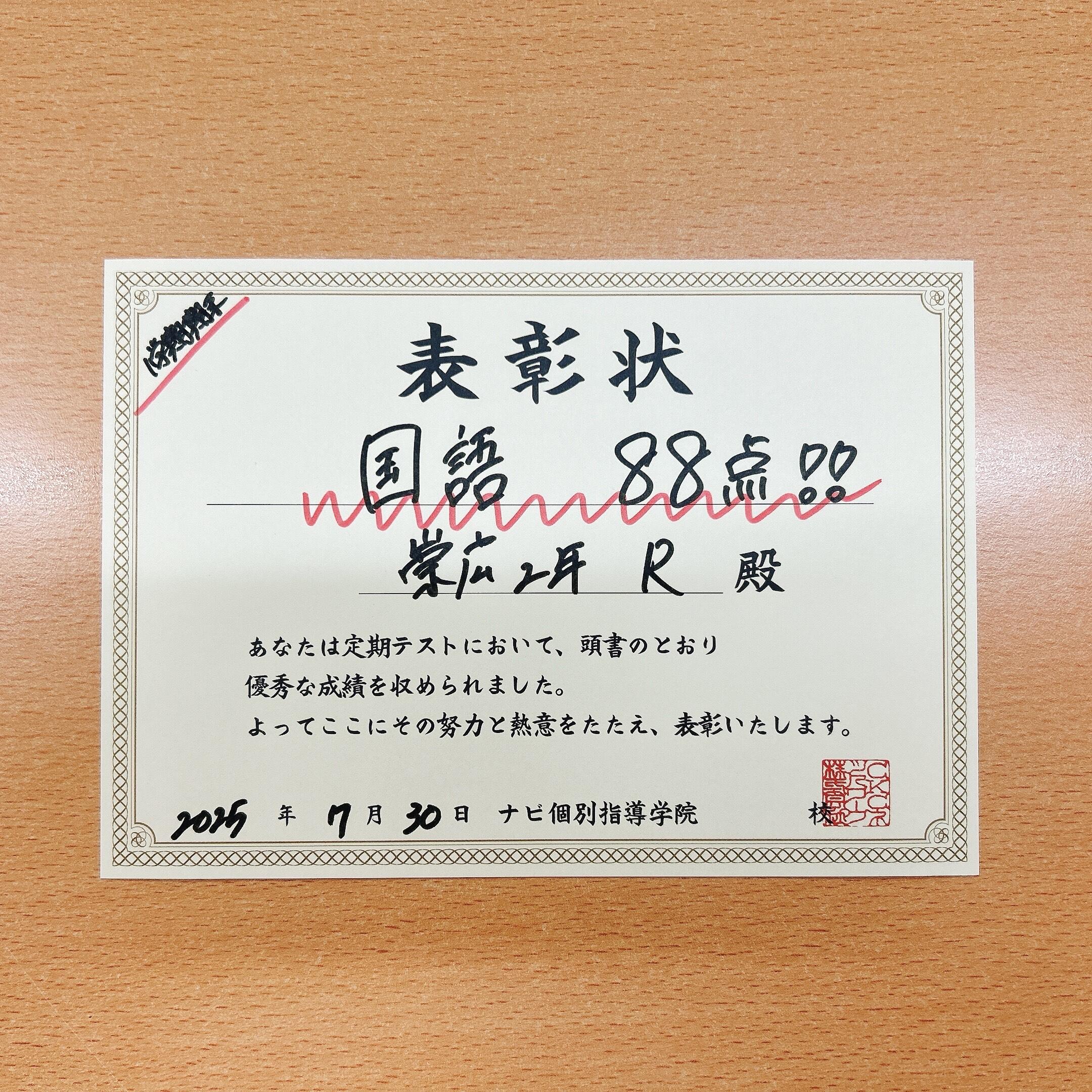 伊賀市の皆様、こんにちは。伊賀市の個別塾、ナビ個別指導学院伊賀校です。嬉しい1学期期末テストの高得点報告です。今日ご紹介するのは崇広中学校2年生の生徒さんです。国語 88点!!すばらしい成績です!!!おめでとう!!!