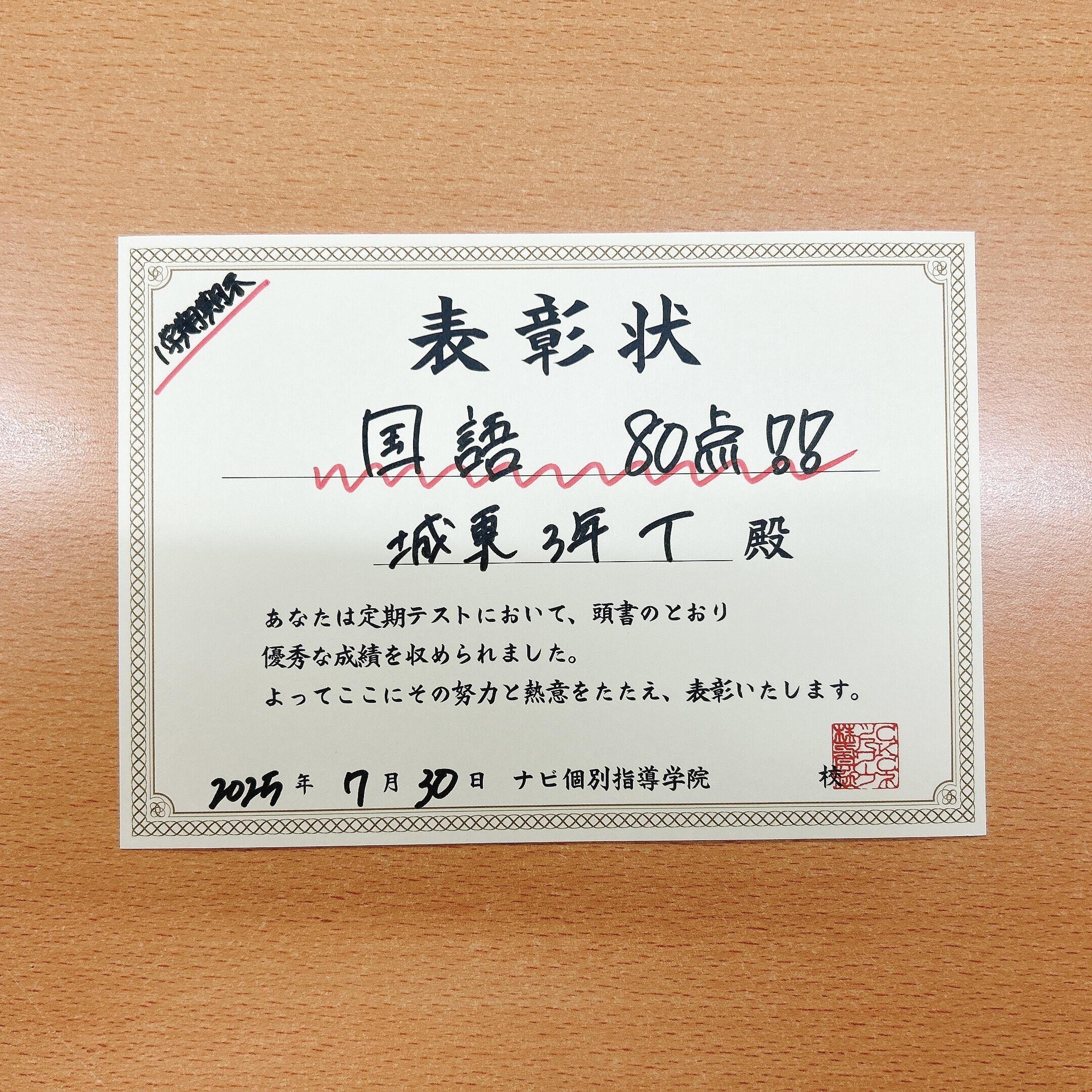 伊賀市の皆様、こんにちは。伊賀市の個別塾、ナビ個別指導学院伊賀校です。嬉しい1学期期末テストの高得点報告です。今日ご紹介するのは城東中学校3年生の生徒さんです。国語 80点!!すばらしい成績です!!!おめでとう!!!