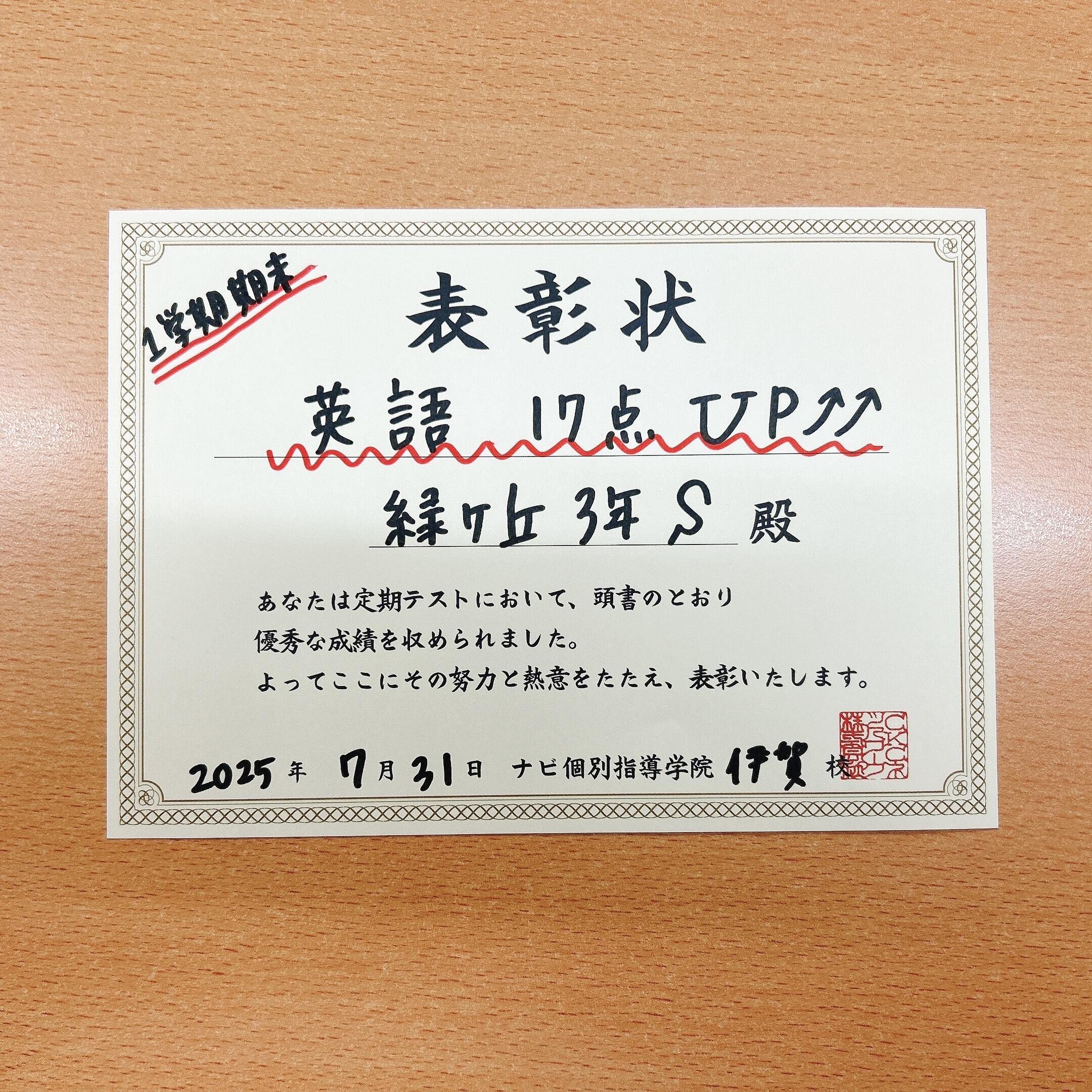 伊賀市の皆様、こんにちは。伊賀市の個別塾、ナビ個別指導学院伊賀校です。嬉しい1学期期末テストの高得点報告です。今日ご紹介するのは緑ヶ丘中学校3年生の生徒さんです。英語 17点UP!!すばらしい成績です!!!おめでとう!!!