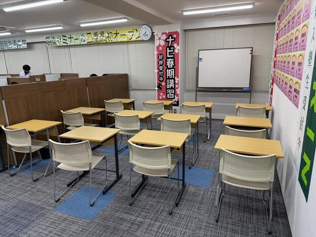 ナビ個別指導学院の授業は、個別の席ごとに設置された自分専用のホワイトボードで解き方や考え方を一緒に確認、それから生徒が問題を解くという「個別授業」スタイルです。