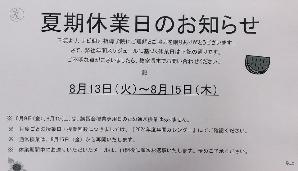 8月9日(金)から8月15日(木)は、講習専用期間・夏期休業期間、となります。