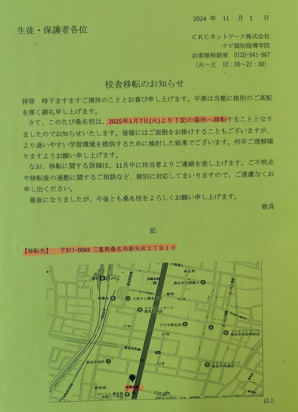尚、1月7日(火)より、新校舎(書面参照)にて営業開始となります。
