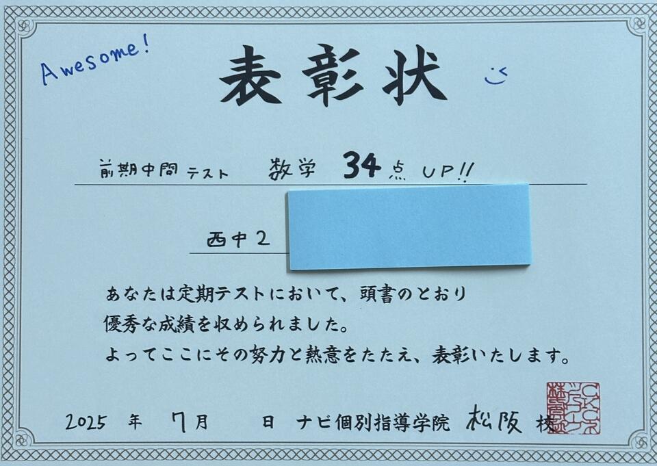 前期中間テスト 西中 点数アップ!