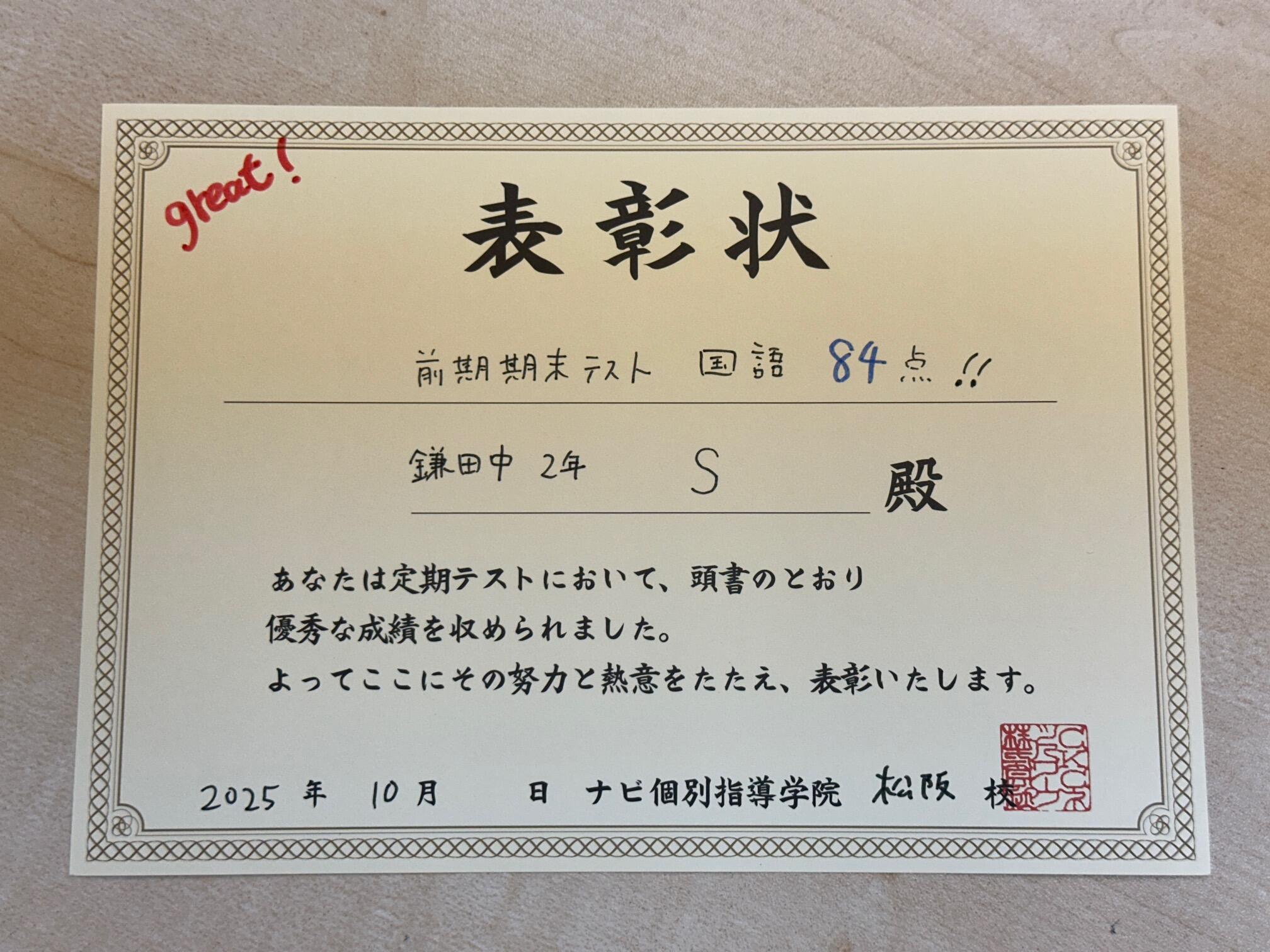 > 前期期末テスト 国語84点!