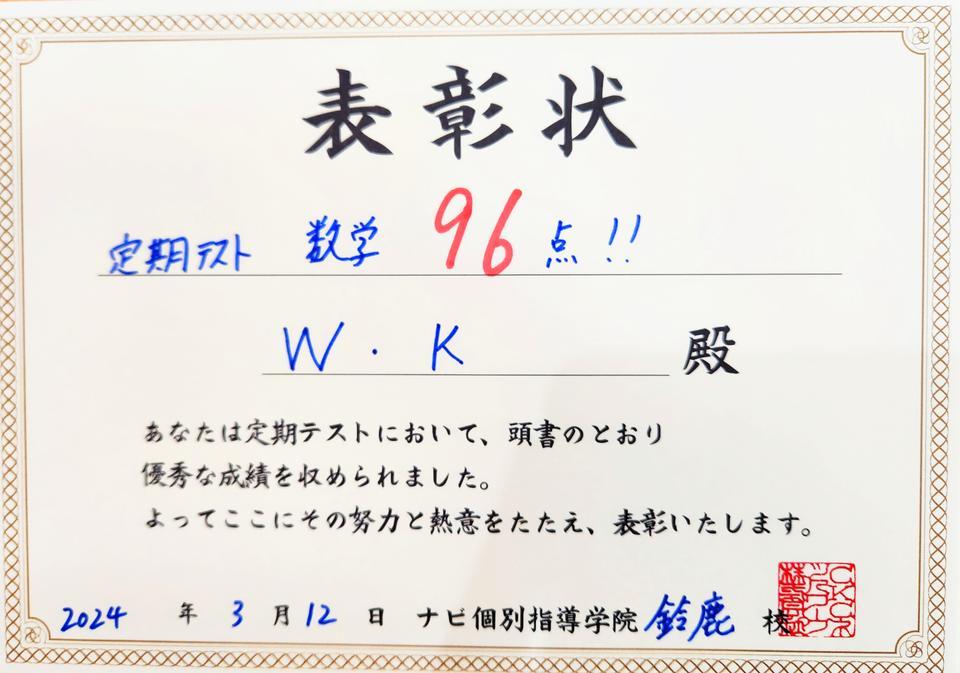 > 学年末テスト 数学96点