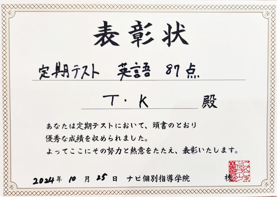 2学期中間テスト 英語87点