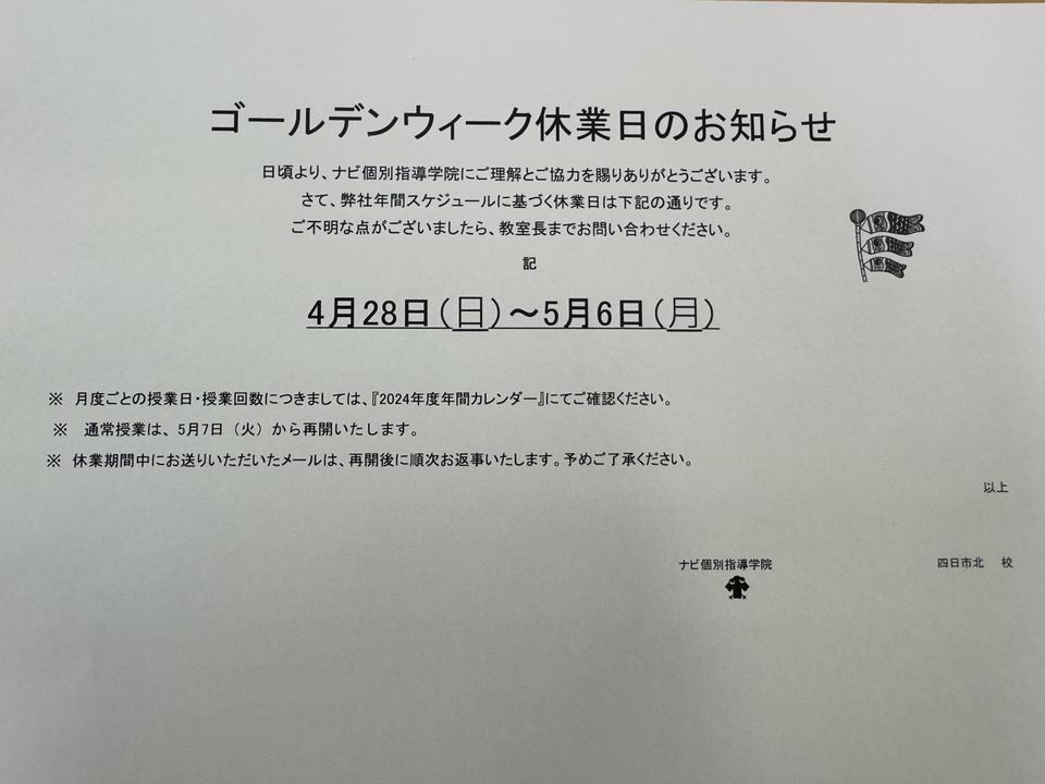 4月28日(日)~5月6日(月)は休業日となります。