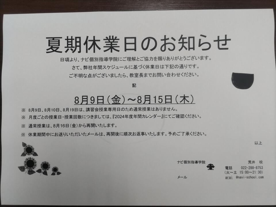 本日は、夏期休業日を載せていますので、