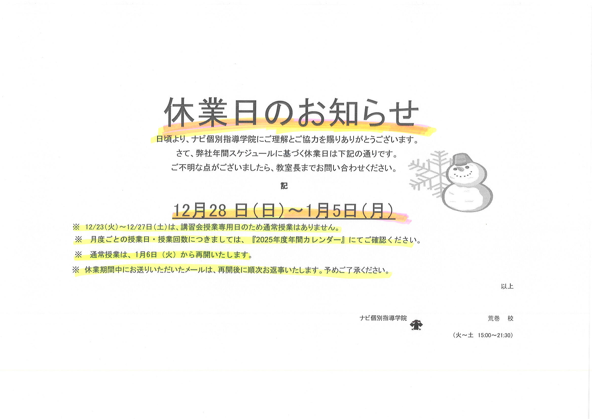 冬期休業日 12月28日(日)~2026年1月5日(月)