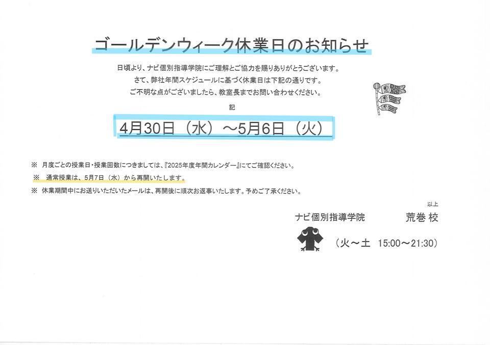 日頃より、ナビ個別指導学院にご理解とご協力を賜りありがとうございます。