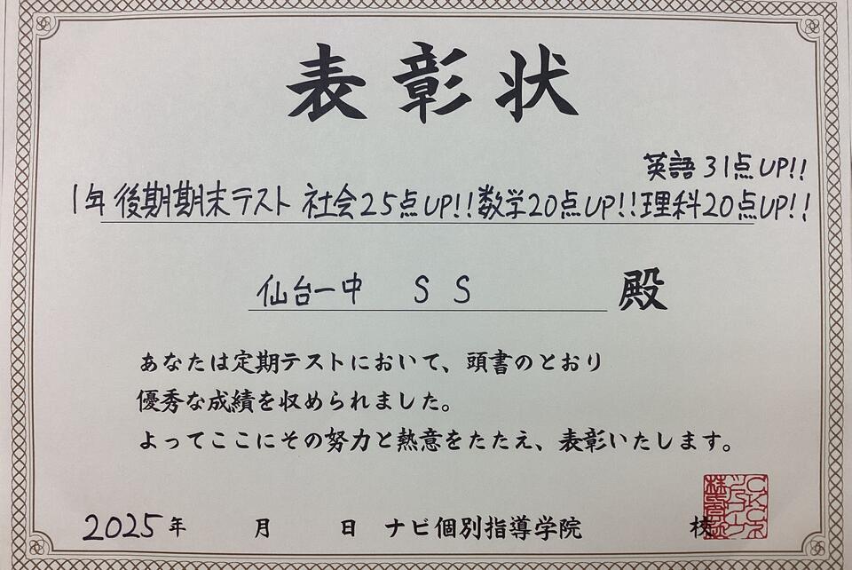 2024年度後期期末テストの成績UPした生徒さんたちのご紹介です!