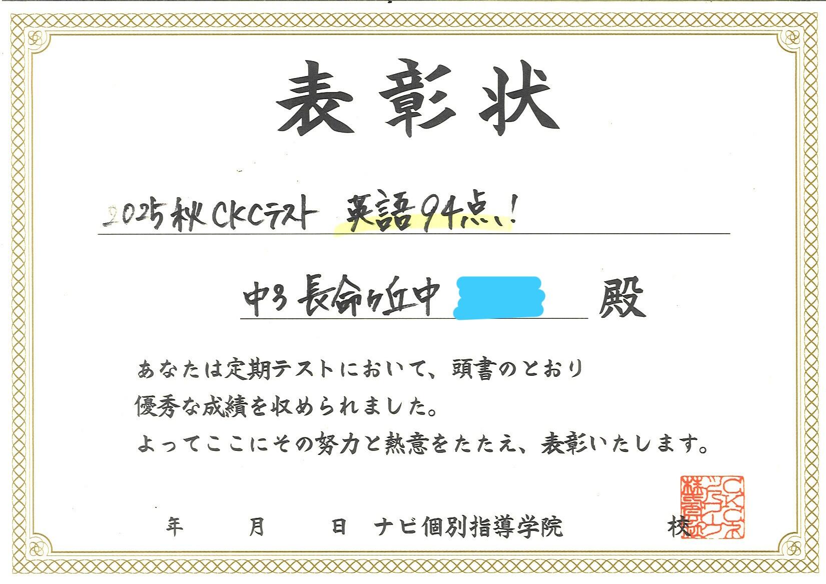 "成績UP事例" 2025秋 中学3年CKCテスト表彰式✨
