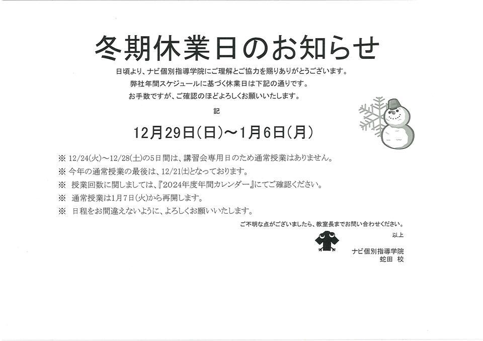 12月29日(日)~1月6日(月)は休講となり、自習スペースのご利用も出来ません。