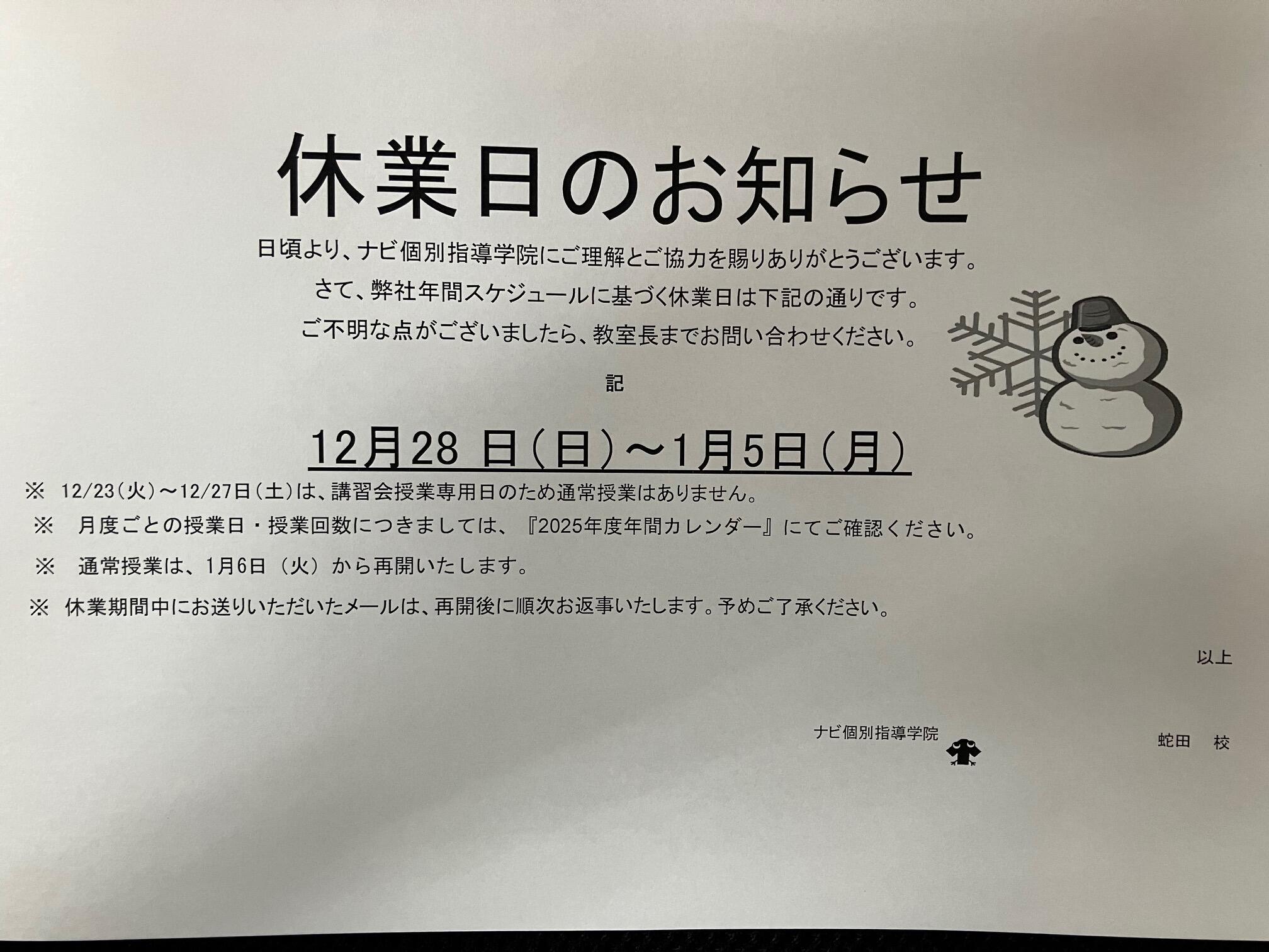 ※12/23(火)〜12/27(土)に関しましては講習会専用日の為、通常授業はお休みです。