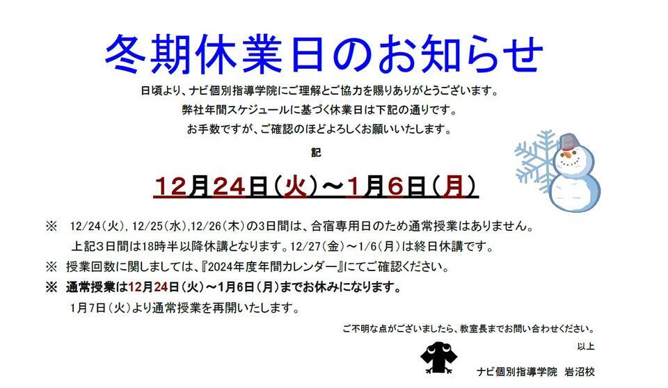 ※12/24㈫、12/25㈬、12/26㈭の3日間は、合宿専用日のため通常授業はありません。