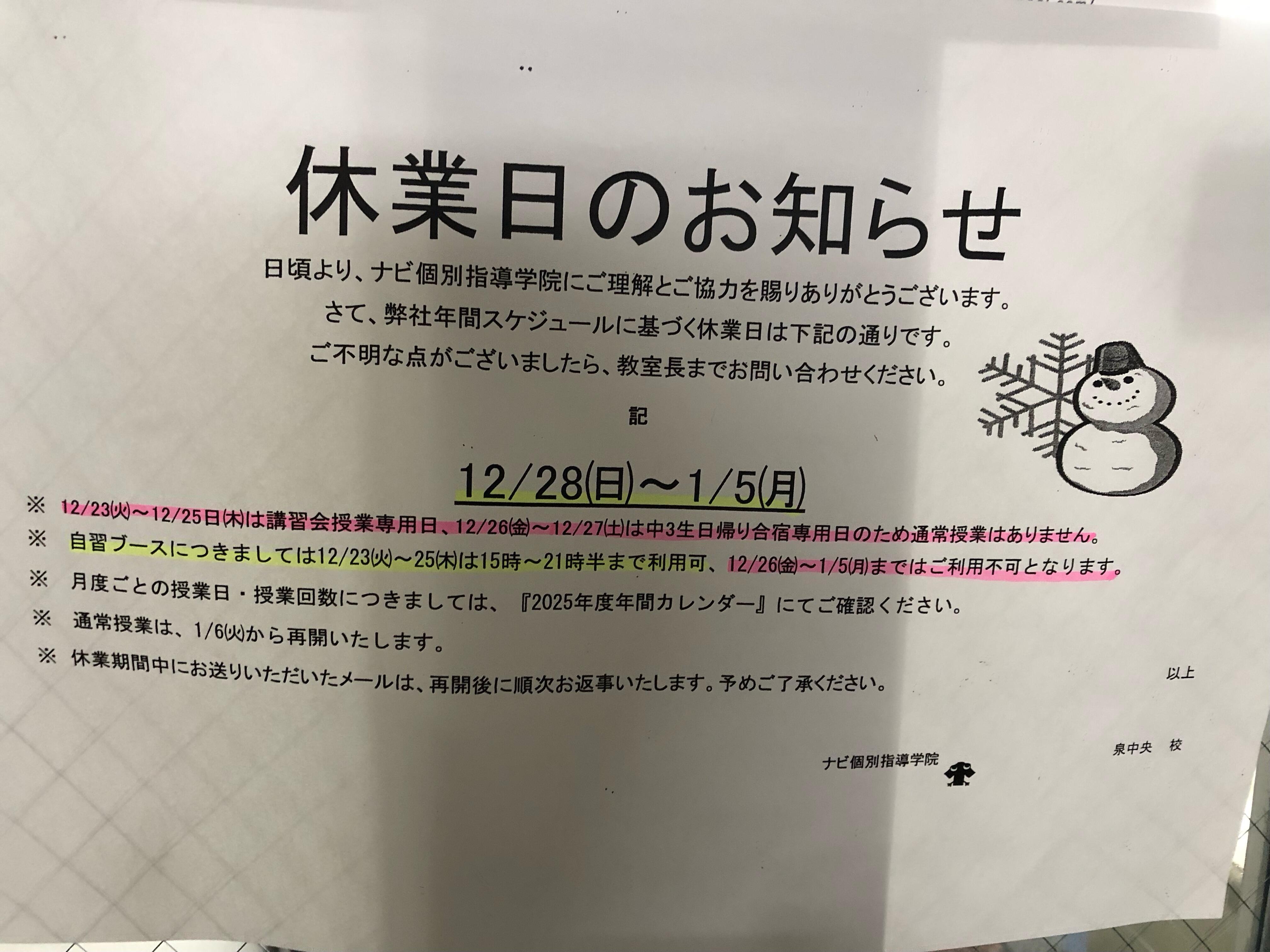 ※12/23㈫〜12/27㈯に関しましては、講習会専用日の為、通常授業はお休みです