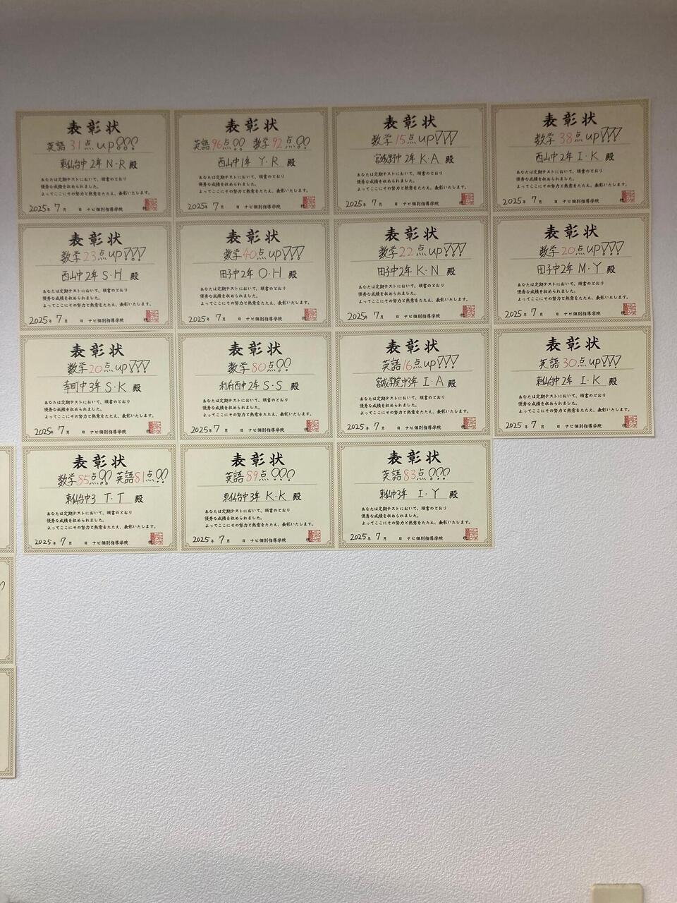 小鶴新田校では定期テストで80点以上、前回比15点以上アップされた生徒に