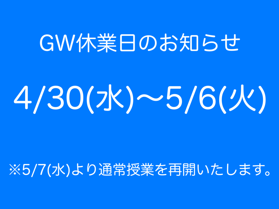 さて、弊社年間スケジュールに基づく休業日は下記の通りです。 GW休業日 4月30日(水)~5月6日(火) 5月7日(水)より通常授業を再開いたします。