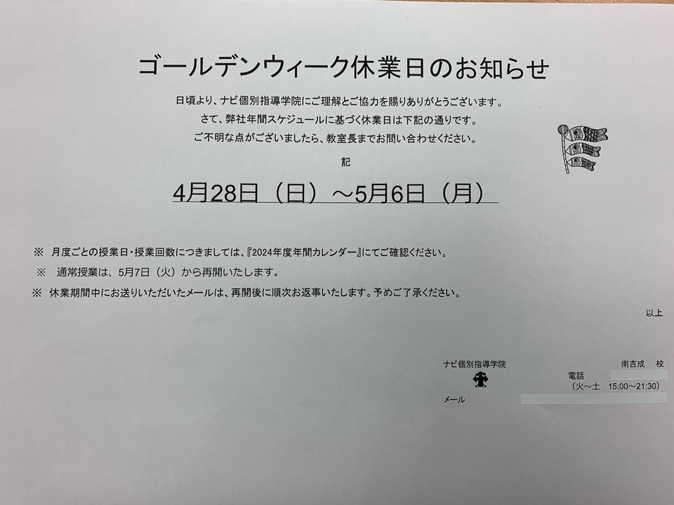 本日はゴールデンウィークによる休業日のお知らせをさせて頂きます。