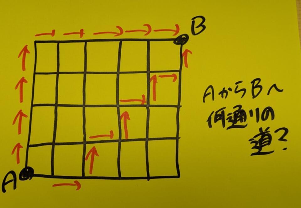 今回は「数学A」から「格子状の道をAからBまで行くとき道は何通りあるか」という問題です。