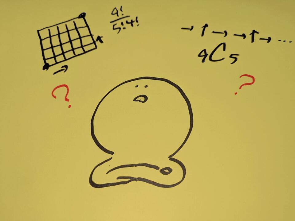 今回の問題なら、全部で9個の道を移動しますが、(↑4回、→5回)